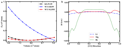 无轨道密度泛函理论采用非定域赝势(NLPPF)和定域赝势(OEPP)计算Be-HCP能量-体积曲线;