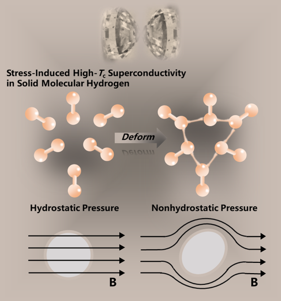 氢是最轻、原子结构最简单,以及宇宙中含量最多的元素。氢单质在常温常压下是由双原子分子组成的非金属气体。早在1935年,诺贝尔物理学奖得主E. Winger教授预言:氢单质在超高压强下可以转变为固态金属。1968年,美国科公司院士N. W. Ashcroft教授提出:金属氢是潜在的高温超导体。科研人员对探索金属氢的奥秘产生了浓厚的研究兴趣,并冠以其“高压物理学界圣杯”的美誉。然而,氢金属化所需的静水压强高达~ 400 GPa,严重地制约着晶体结构和电输运性质的测试研究,导致金属氢相关报道长期存在未知和异议。需要注意的是,超高压极端条件下(如 > 300GPa),实验样品腔内会不可避免地引入不均匀变形和各向异性应力,而这种非静水压环境对固态氢结构和物性的调控效应尚不清楚。