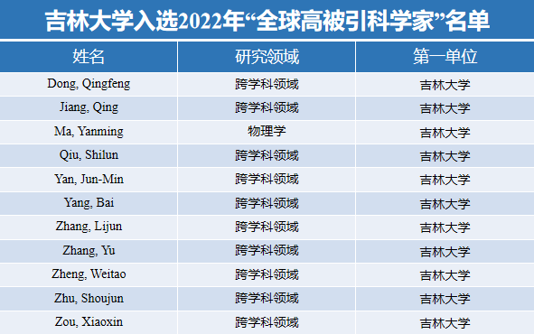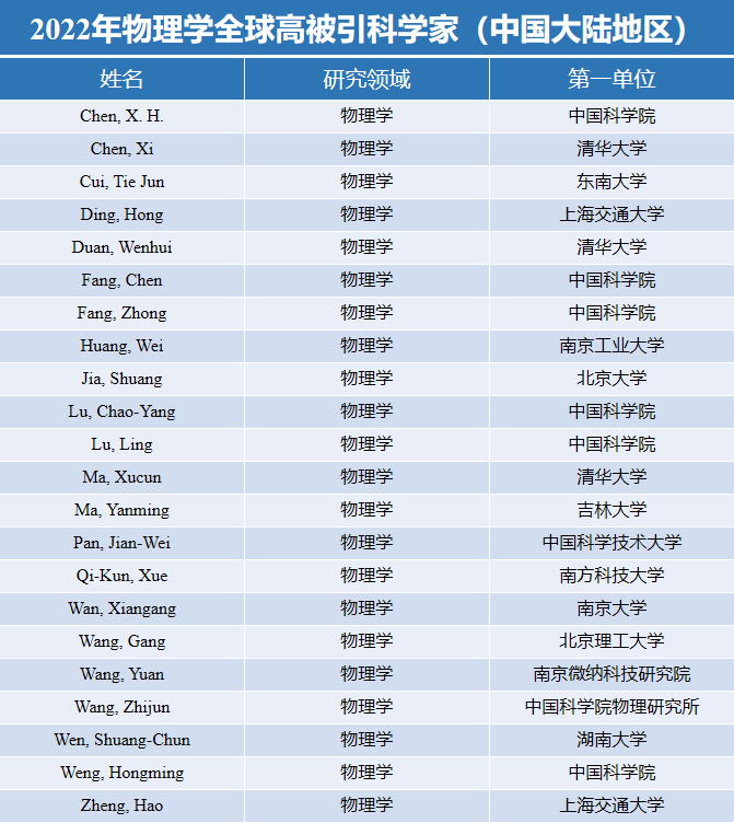 在物理学领域中国大陆地区共有22位学者入选。马琰铭教授再次入选,这也是马琰铭教授连续第六年入选。