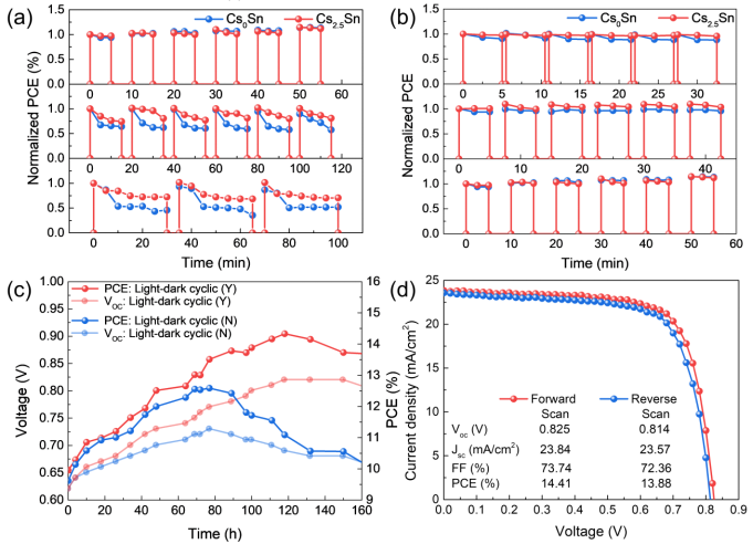 图4. 光-暗循环测试下的锡基钙钛矿太阳能电池J-V特性演变