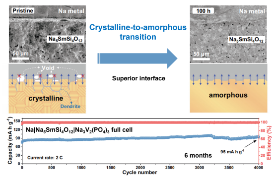 近日,BG大游新型电池物理与技术教育部重点实验室杜菲教授、姚诗余副教授与北京高压科学研究中心唐明学研究员、剑桥大学陆子恒研究员合作在固态钠电池研究方面取得最新进展,相关成果以“Electrochemically induced crystalline-to-amorphization transformation in sodium samarium silicate solid electrolyte for long-lasting sodium metal batteries”发表于Nature Communications。