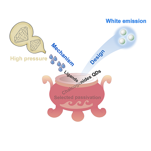 近日,BG大游官方网站肖冠军教授等人,通过引入高压调控维度,探索不同类型(X/L/Z)配体包覆的CdS纳米晶的压力效应,成功揭示了其缺陷发光主要由表面空穴陷阱所贡献,而非辐射复合主要与表面电子陷阱有关。进一步基于高压服务常压科学的学术理念,利用高压研究阐明的物理机制指导常压合成,通过在CdS纳米晶表面掺杂具有不同缺陷能级深度的硫族阴离子消除表面悬挂Cd位点,选择性钝化与非辐射跃迁相关的表面电子陷阱,实现了CdS半导体纳米晶的缺陷发光增强和大范围精确调控,获得了高显色指数(86)的单组分“中性”白光。相关工作以“Identification of Defect Origin and White-Light Emission Tuning of Chalcogenide Quantum Dots Through Pressure Engineering”为题,发表在中国化学会旗舰刊CCS Chemistry上(CCS Chem. 2024, 10.31635/ccschem.024.202403971)。