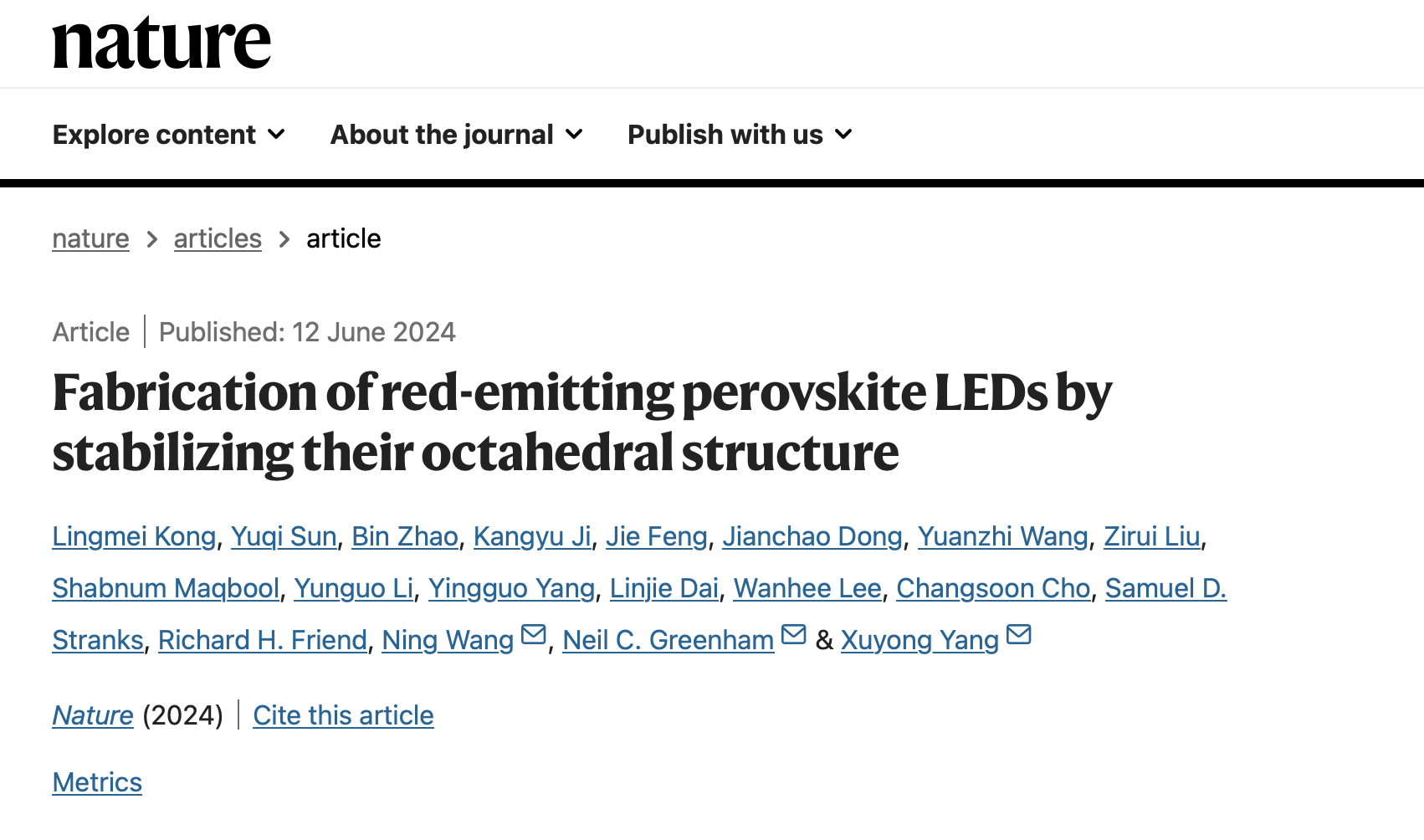 北京时间2024年6月12日23时,国际学术期刊《Nature》(自然)在线刊发了BG大游凝聚态物理系王宁教授团队与剑桥大学卡文迪许实验室Neil C. Greenham教授团队、上海大学新型显示技术及应用集成教育部重点实验室杨绪勇教授团队等人的合作研究成果:“Fabrication of red-emitting perovskite LEDs by stabilizing their octahedral structure” (Nature, 2024,DOI: https://doi.org/10.1038/s41586-024-07531-9)。