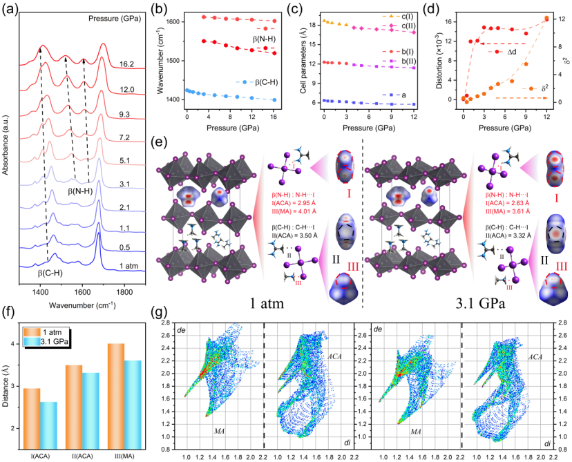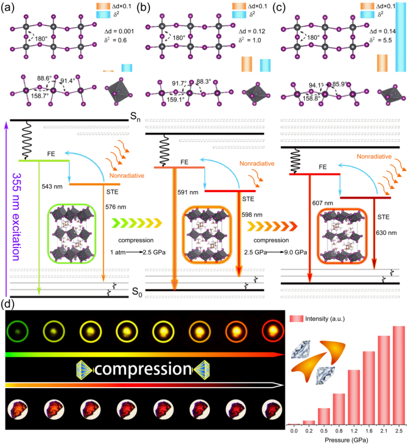 在压力约束下,实现了键角及轨道耦合作用的有效调控,主要归因为(ACA)(MA)PbI4层内两种不同有机组分与无机{PbI6}八面体单元之间相互作用强度的不一致所导致的。同时,压力诱导{PbI6}八面体单元扭曲,抑制非辐射跃迁,结合电子联通性的减弱,最终导致自由激子与自陷激子荧光发射强度的大幅提升。