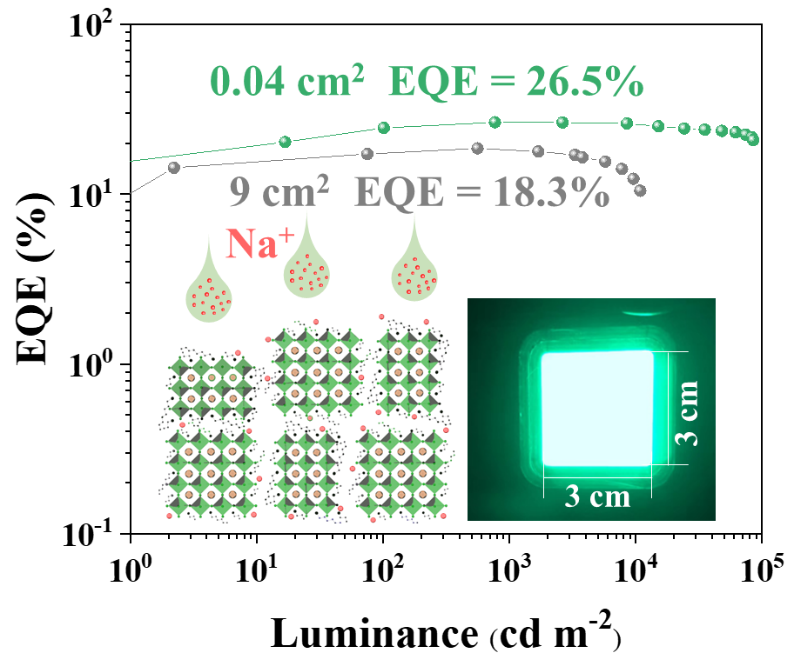 基于此,本工作提出了一种溴化钠(NaBr)辅助结晶的方法,该方法可以有效调控Q-2D钙钛矿薄膜自上而下的结晶过程,并精确调控薄膜在垂直空间的相分布。此外,Na+与PbBr64-之间的强相互作用在钝化表面溴空位缺陷和抑制非辐射复合方面起到了关键作用。不仅如此,由于Na+的存在,其部分取代了薄膜表面的有机配体,显著减少了有机配体的含量,提高了器件的载流子传输能力。最终,器件的外量子效率(EQE)达到了的26.5%。即使将器件有效面积扩大200多倍,效率仍可达到18.3%。