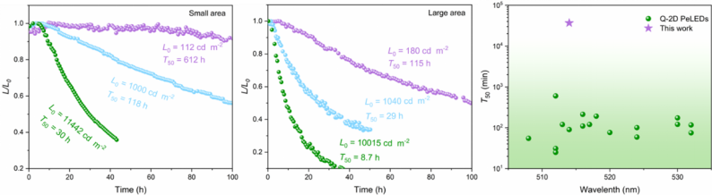 此外,缺陷的钝化和载流子传输能力的提升也显著增强了器件的运行稳定性。在100 cd/m²的初始亮度下,小面积和大面积器件的运行半寿命(T50)分别高达612小时和112小时,这一突破为钙钛矿发光二极管的大规模应用带来了新的借鉴,未来有望在全彩显示和固态照明等领域实现广泛应用。