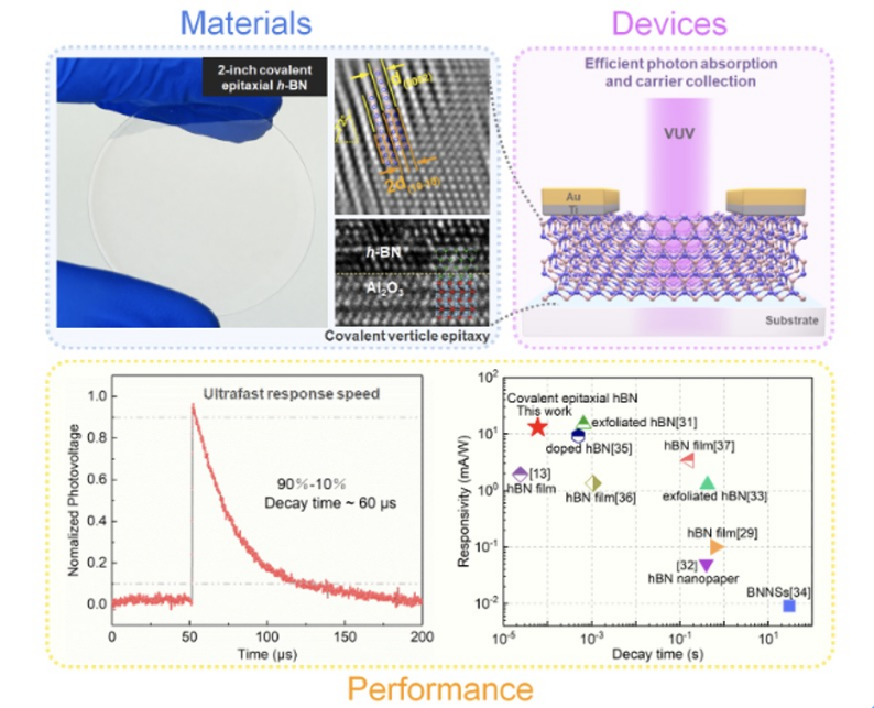 图一 两英寸共价异质外延h-BN材料、器件及光电探测性能