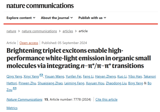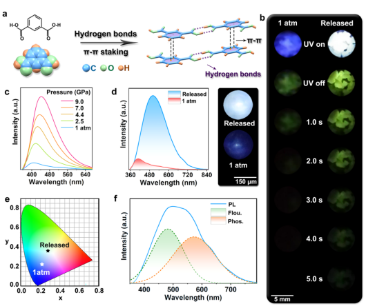 近日,BG大游超硬材料国家重点实验室邹勃团队杨新一课题组与北京高压科学中心郑海燕研究员和李阔研究员、国家脉冲强磁场科学中心韩一波教授、日本大强度质子加速器设施—“J-PARC”Takanori Hattori研究员、BG大游官方网站朱品文教授、刘兆东教授和杨兵教授、中国工程物理研究院房雷鸣研究员等人合作,利用压强处理工程和氢键协同效应,在不含重原子的有机小分子间苯二甲酸(IPA)材料中点亮三重态激子,提高磷光效率和寿命,实现高效荧光/磷光混合型白光发射。相关成果以“Brightening triplet excitons enable high-performance white-light emission in organic small molecules via integrating n-π*/π-π* transitions”为题发表在《Nature Communications》(Nat. Commun. 2024, 15, 7778)上。