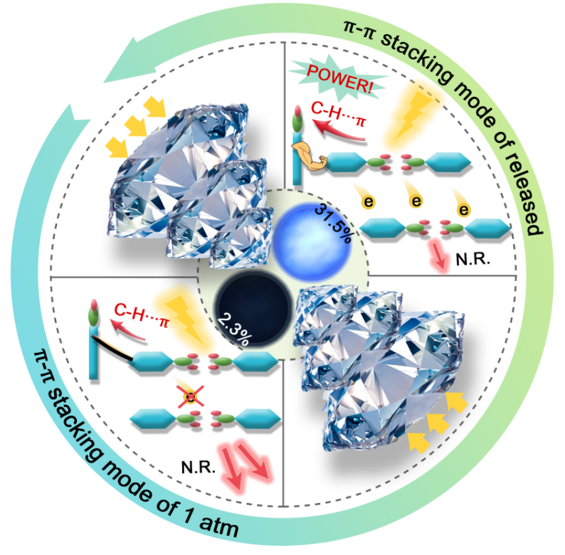 具有缺电子基团和芳香环的有机分子由于p-π*共轭效应可以促进分子内电荷转移,为开发高效发光材料提供广阔的应用平台。然而,在形成聚集体时,吸电子能力使芳香环π电子密度降低,从而降低了芳香环间的静电斥力。这将导致π-π相互作用增强,降低荧光量子产率。高压作为独立于温度和化学组分的热力学参量,可以有效地缩短原子间距离、改变材料的晶体结构,进而使材料产生优异的光学性质。基于此,杨新一课题组提出利用压强处理策略调控分子堆积方式,实现初始弱荧光有机材料的高效蓝光发射。