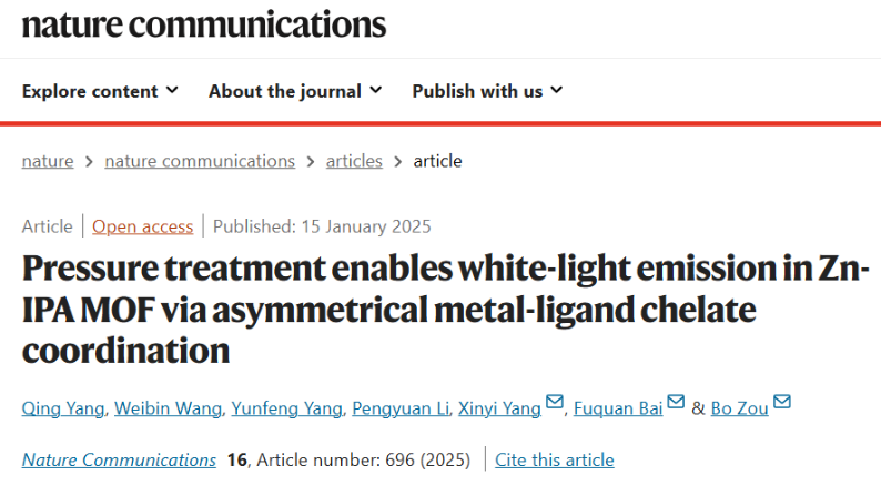 近日,BG大游官方网站高压与超硬材料全国重点实验室/综合极端条件高压科学中心杨新一教授等人基于压强处理工程调控Zn-IPA金属-有机框架(MOFs)材料的结构刚性和配位构型,实现了Zn-IPA高效荧光/磷光混合型白光发射。相关成果以“Pressure treatment enables white-light emission in Zn-IPA MOF via asymmetrical metal-ligand chelate coordination”为题发表在《Nature Communications》(Nat. Commun. 2025, 16, 696)上。