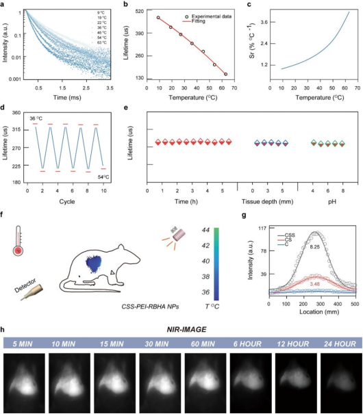 5. (a) 温度依赖的荧光寿命;(b) 寿命与温度的校准曲线;(c) 相对灵敏度;(d)加热-冷却循环中的寿命;(e)连续激光照射、不同pH和组织穿透深度下的寿命;(f) 注射CSS-PEI-RBHA NPs后活体小鼠肝脏的温度成像;(g) NIR成像信噪比;(h) 使用CSS-PEI-RBHA NPs的活体实时NIR成像。