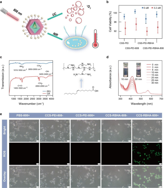 4.(a) ROS生成过程中温度监测示意图;(b) 细胞活性;(c) OA修饰和PEI修饰CSS NPs的FT-IR光谱;(d) 808 nm照射不同时间的吸收光谱;(e) 不同条件下ROS的生成检测。