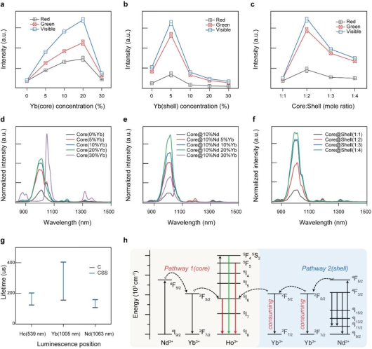 1. (a-c) 可见光区域发光增强;(d-f) NIR区域发光增强;(g)荧光寿命变化图;(h) CSS NPs中的能量转移机制和发光增强机理图。