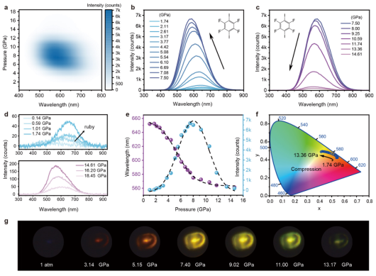 室温磷光(RTP)材料因其独特的长寿命发光特性、显著斯托克斯位移及丰富的激发态行为,在智能传感、生物成像及光电器件等领域具有广阔的应用前景。然而,这类材料涉及复杂的激发态动力学过程,使得其对外界刺激的响应机制研究面临挑战。静水压作为一种精确、干净的物理调控手段,可通过调控分子堆积模式和电子能级结构,为揭示材料构效关系提供独特的研究视角。碳基发光材料因其独特的分子可设计性和结构可调性,能够通过精确控制分子构象与分子间相互作用来实现发光性能的精准调控,已成为光电功能材料领域的研究前沿。然而,这类材料在高压环境下普遍遵循发射红移和荧光猝灭的常规响应行为。开发具有反常压致蓝移增强发光特性的材料体系不仅具有重要的科学价值,还能拓展其在高压传感等领域的应用。值得注意的是,这类反常发光材料极为罕见,尤其是在碳骨架室温磷光材料体系中尚未见报道,这主要源于RTP材料复杂的激发态动力学过程:三重态激子的生成与调控涉及自旋禁阻跃迁和精细的能量传递过程,其高压响应行为受到激发态构型的严格限制,使得实现反常压致发光调控极具挑战。因此,突破RTP材料的高压响应瓶颈,特别是实现反常的压致发光行为调控,已成为当前光电功能材料领域亟待解决的关键科学问题之一。这不仅将深化对有机磷光机理的理解,还将为新型智能发光材料的开发提供重要指导。