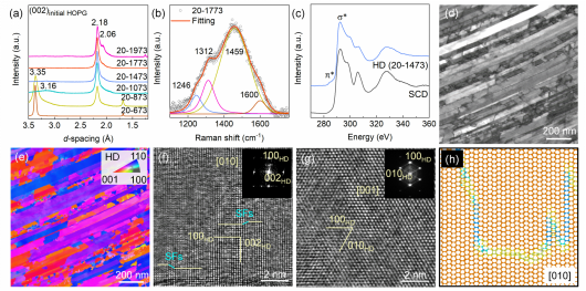 6. 在20 GPa-1200 ℃条件下,分别沿z轴和xy平面热压缩石墨实现向六方金刚石(HD)和立方金刚石(CD)的相变研究。