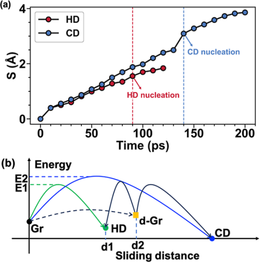 5. (a)成核过程中的石墨层滑动距离; (b) 滑动距离对HD和CD形成影响的示意图。