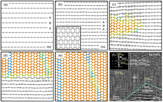 研究团队还与中山大学候仰龙教授、朱升財教授团队合作阐明了六方金刚石在高温高压环境下的形成机制,指明了石墨基面AB层堆叠和抑制层间的过度滑移是合成六方金刚石的关键。发现当石墨ABAB堆垛保持良好,沿石墨[001]方向的准单轴压缩抑制横向滑移,温度条件温和时,石墨会转变为HD;而当ABAB堆垛受到干扰或层滑移距离较大时,石墨会转变为CD。