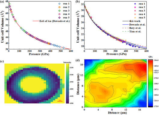 图:最高压力至527 GPa的金属钨状态方程,基于X射线衍射扫描数据建立的500 GPa压力下t-DAC压力分布图