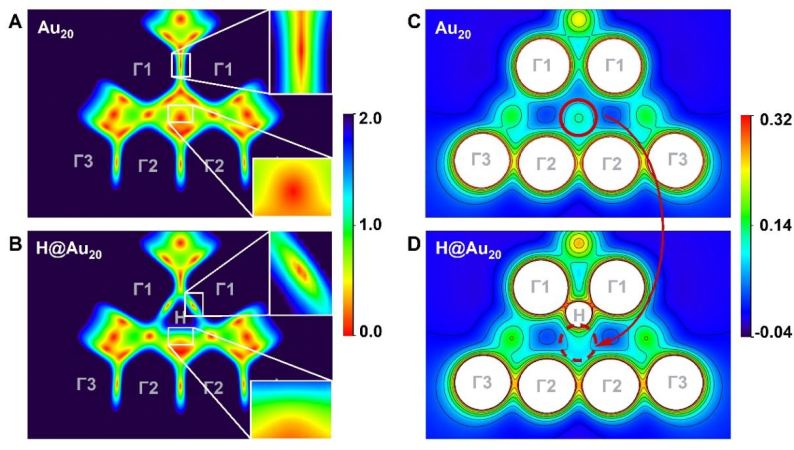 图2. 键合变化与机理阐释。(A) Au20和(B) H@Au20的相互作用区域指示函数图。(C) Au20和(D) H@Au20的总静电势图。色标数值单位为原子单位。