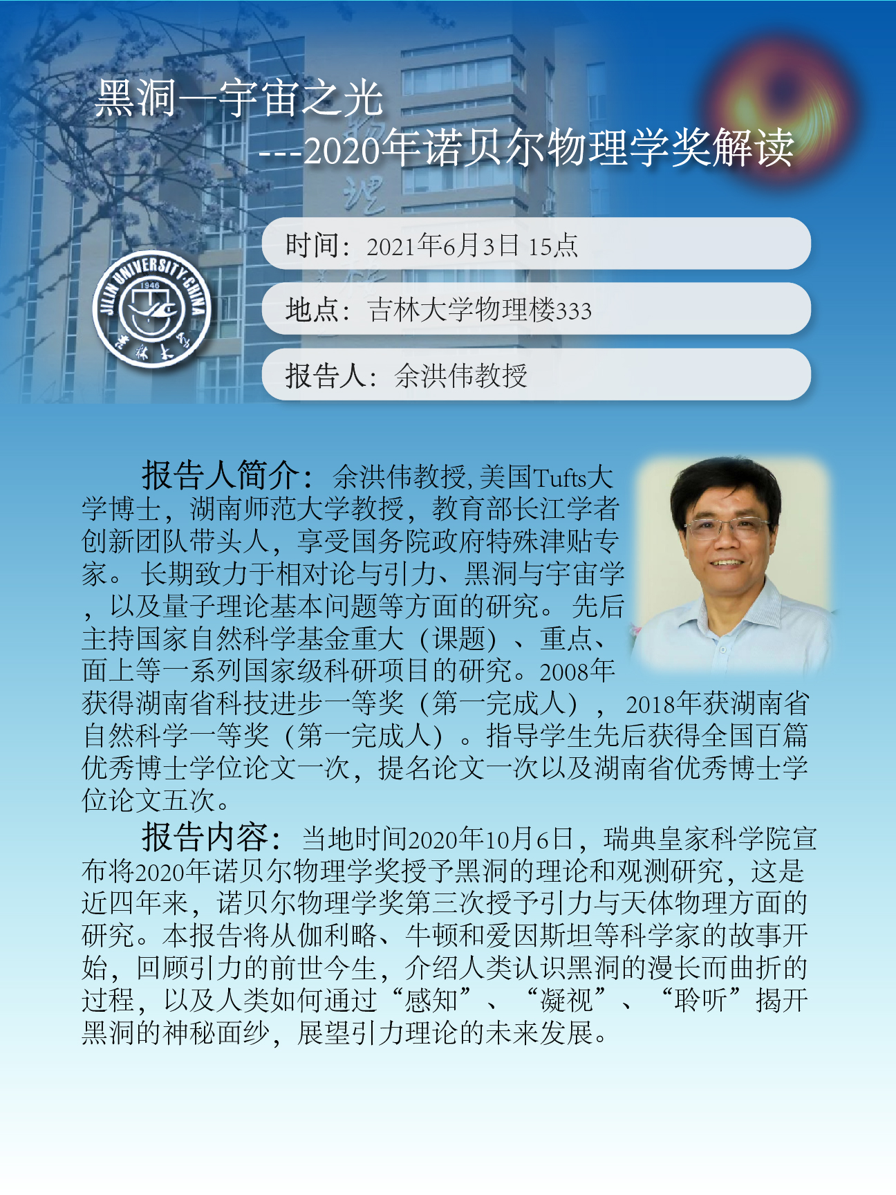 报告题目:黑洞—宇宙之光---2020年诺贝尔物理学奖解读