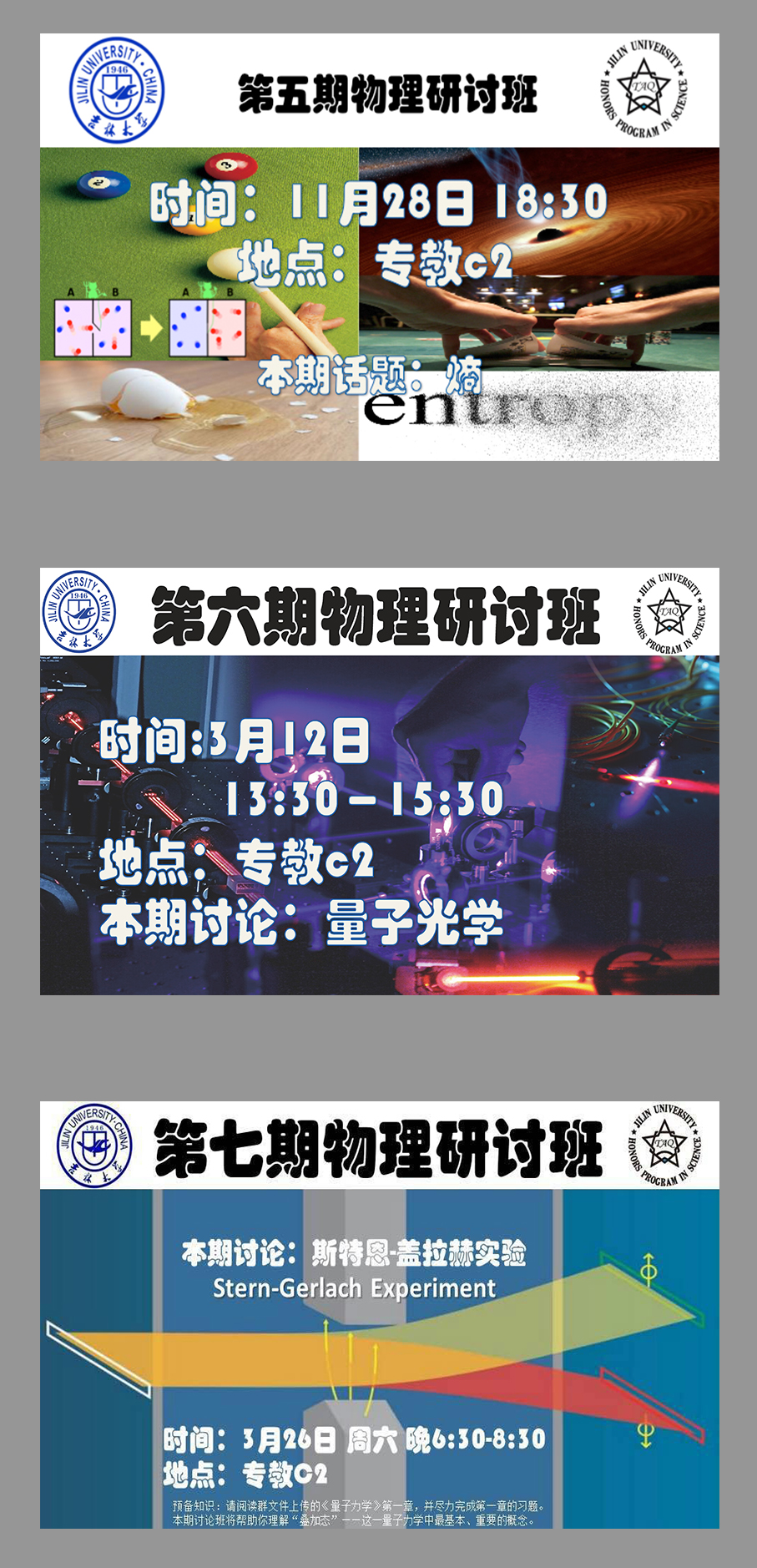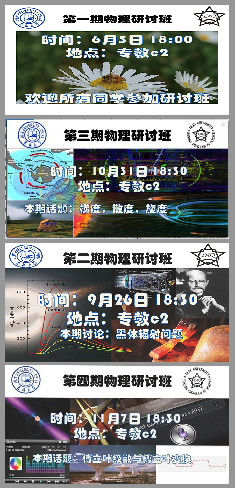 物理研讨班”目前已举办了七期,内容涉及“玻色爱因斯坦凝聚”,“黑体辐射”,“梯度,旋度,散度”,“傅立叶级数与傅立叶变换”,“熵”,“量子光学(光与原子相互作用)”,“斯特恩-盖拉赫实验”等等,每期活动时长约为2个小时,得到了BG大游相关教师的大力支持。