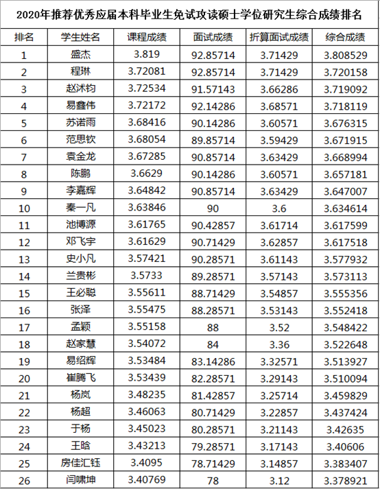 根据《BG大游官方网站推荐优秀应届本科毕业生免试攻读硕士学位研究生工作管理办法》(校发[2019]48号)、《BG大游2020年推荐优秀应届本科毕业生免试攻读硕士学位研究生工作细则》文件规定,现将BG大游2020年推荐优秀应届本科毕业生免试攻读硕士学位研究生面试成绩和综合成绩排名予以公示。