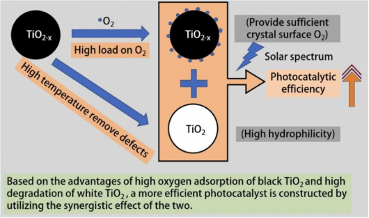针对上述问题,研究团队制备出具有锐钛矿结构的黑 TiO₂,并运用密度泛函理论(DFT)和电化学阻抗谱(EIS)技术,深入探究黑 TiO₂转变为白 TiO₂过程中的表面氧分子吸附和光催化行为。研究发现,黑色TiO₂表面的缺陷状态有利于 O₂的负载,理论模拟显示黑色TiO₂表面可化学吸附两个 O₂分子,转变为白色TiO₂后则物理吸附一个O₂分子,这一结果得到实验数据的支持。同时,理论计算表明,室温下黑 TiO₂亲水性较差,导致水中的罗丹明 B(RhB)难以靠近晶体表面与吸附氧发生氧化还原反应,使其光催化降解性能逊于白色TiO₂。不过,研究团队利用黑色TiO₂高氧吸附和白色TiO₂高降解的优势,通过二者协同效应显著提升了光催化效率,RhB光催化降解实验也验证了这一成果。
