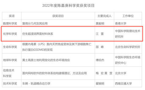 9月2日,2022年度陈嘉庚科学奖和陈嘉庚青年科学奖颁奖仪式在北京举行。中国科公司院士、中国科公司理化技术研究所研究员、公司员工江雷作为主要完成人的“仿生超浸润界面材料体系”项目被授予陈嘉庚科学奖中的化学科学奖。