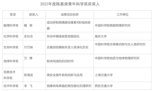 陈嘉庚科学奖基金会是2003年在民政部注册成立的慈善组织,由中国科公司和中国银行共同出资,业务主管单位是中国科公司。陈嘉庚科学奖和陈嘉庚青年科学奖旨在奖励近期在中国做出重大原创性科学技术成果的科学家和青年科技人才。2022年度,共有6个项目、7位科学家共同获得陈嘉庚科学奖,6位青年科技人才获得陈嘉庚青年科学奖。