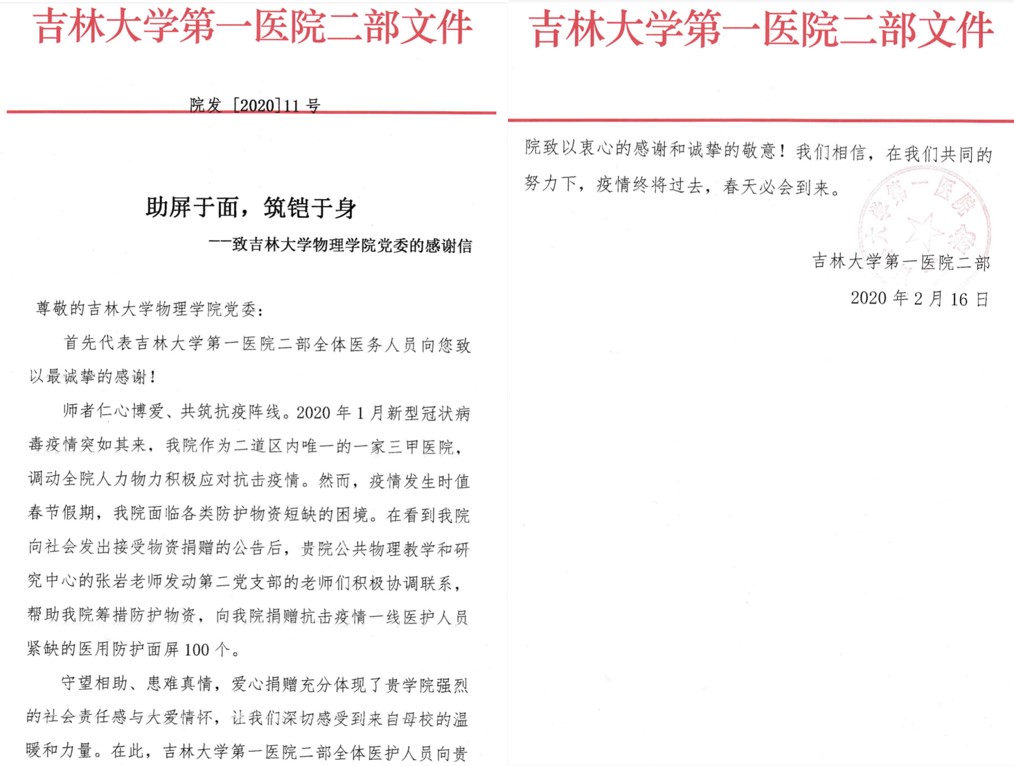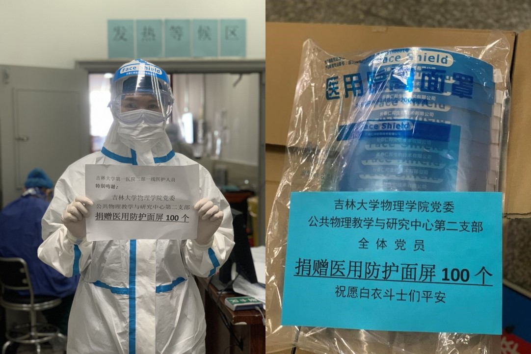 公共物理教学与研究中心第二支部党员得知目前这种情况,希望能为医院疫情防控工作尽一份自己的绵薄之力,每位党员努力寻找各种关系、各个渠道,来筹集正规厂家生产的合格医务用品。直到前几天联系到长春仁邦生物技术有限公司生产的医用隔离面罩100个,捐赠给吉大一院二部医务部。医务部张冀代表一线医护人员对各位老师表示感谢!