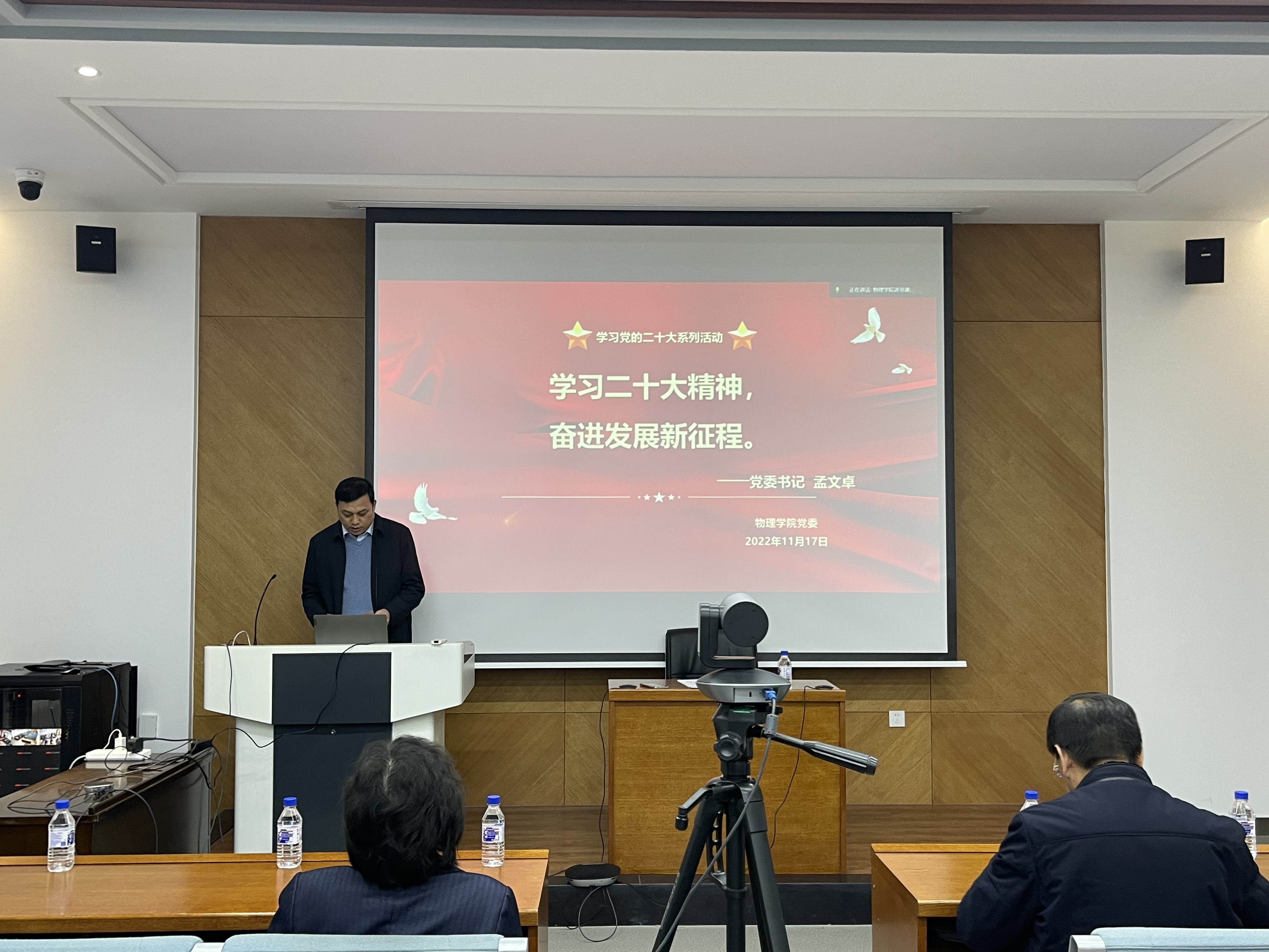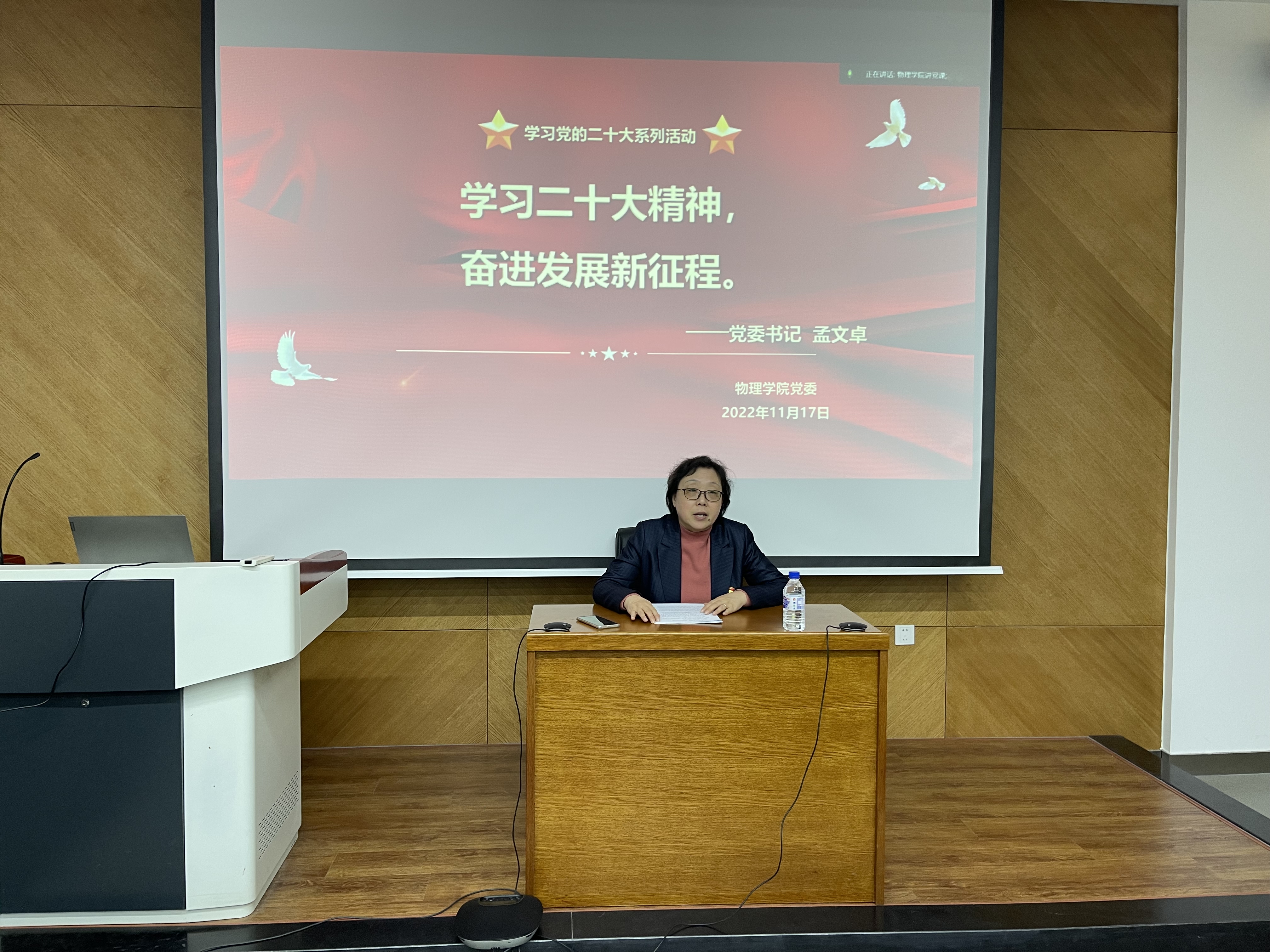 孟文卓强调,学习宣传贯彻党的二十大精神是当前和今后一个时期全党全国的首要政治任务。党的二十大在政治上、理论上、实践上取得了一系列重大成果,新时代新征程党和国家事业发展制定的大政方针和战略部署,是我们党团结带领人民全面建设社会主义现代化国家、全面推进中华民族伟大复兴的政治宣言和行动纲领。作为高校师生,要按照习近平总书记提出的“全面学习、全面把握、全面落实”的要求,坚持原原本本学、融会贯通悟、联系实际思、扎扎实实做,切实把二十大精神融入教学科研学习和立德树人根本任务的全过程,把学习宣传贯彻党的二十大精神与学习贯彻习近平总书记关于教育重要论述结合起来,把党的二十大精神转化为指导实践、推动工作的强大力量,以更加昂扬的精神状态、更加务实的工作作风将党的二十大精神落地落实、见行见效。