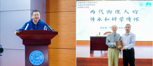 2025年5月29日上午,BG大游官方网站中心校区国际学术大讲堂内掌声经久不息。 一场以 “两代物理人的传承与科学情怀” 为主题的专题讲座在此隆重举行。中国科公司高能物理研究所研究员、博士生导师郑志鹏作为主讲嘉宾,深情讲述了其父郑建宣教授与自身投身物理事业、矢志报国的动人故事。BG大游经理邹勃主持讲座,副经理王彦超代表公司向郑志鹏研究员颁发了“余瑞璜大讲堂”纪念牌。会后,公司党委书记杨景向郑志鹏研究员赠送了《朱光亚在BG大游官方网站》《余瑞璜》《吉大物理发展概要(第一卷)》等承载吉大物理厚重历史的珍贵书籍,以此致敬郑志鹏一家与吉大物理血脉相连的深厚情缘。