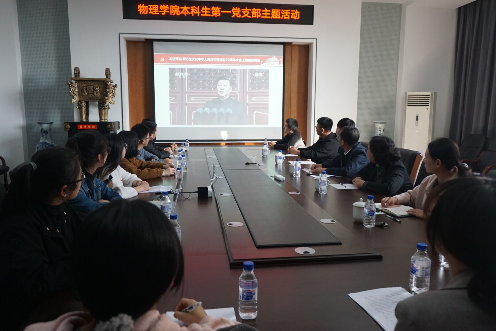 在集体学习阶段,全体成员共同观看《习近平在庆祝中华人民共和国成立70周年大会上发表讲话视频》,回顾《(1949年10月1日)开国大典原始影像》和党支部开展理论学习、先锋工程的视频集锦;在场师生党员坚信“没有任何力量能够撼动我们伟大祖国的地位,没有任何力量能够阻挡中国人民和中华民族的前进步伐。” 在座谈阶段,支部党员围绕“壮丽70年,奋斗新时代,融我青春梦入祖国发展”主题,从军事、经济、文化产业、家国情怀、爱国情怀、老一辈物理科学家、生活中的榜样、体育精神等方面结合自己的目标及感受展开发言,纷纷表示将以饱满的热情、昂扬的精神积极投身到学习工作中,将小我融入大我,将青春献给祖国,努力为祖国昌盛贡献力量,并共同重温入党誓词。