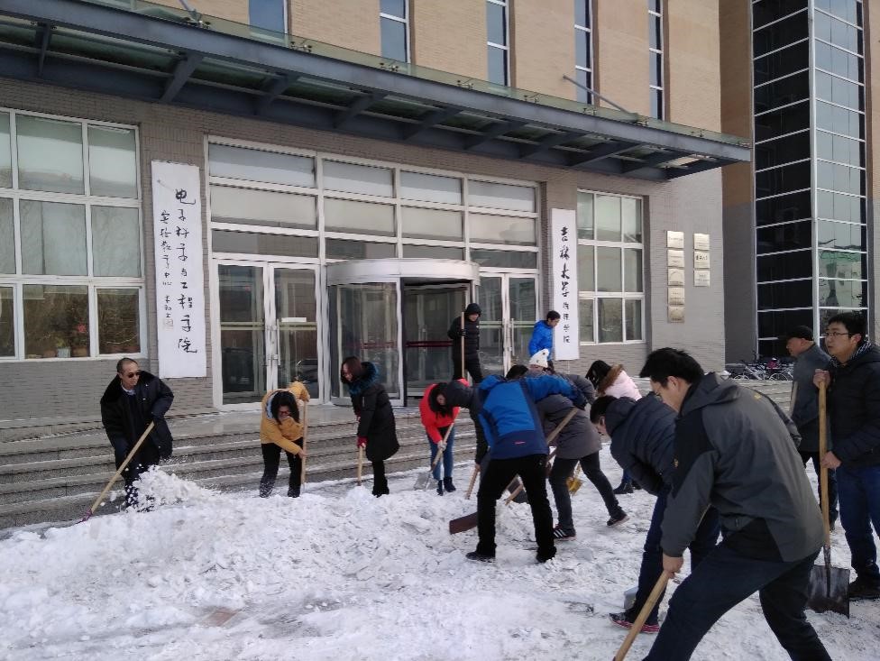 2017年2月23日临近开学,长春市突降大雪,大雪给吉大校园带来了巨大的不便。以往,清雪工作都是由本科员工来完成,但此时员工们并未返校,BG大游的党员教师们主动承担了扫雪工作。