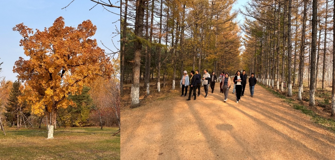 秋季的百木园金色满园,阳光明媚,空气清新,老师们从百木园正门进入,一股花草树木的气息直通心扉,漫步于此到处都透露着愉悦和惬意。顺着园内的小路向北走不远,一棵形似宝塔一样的古树出现在老师们面前,有直冲云霄的气势,据说这棵冷杉古树树龄有100多年。经过休闲区继续向北走,就来到了500余米的“黄金大道”,满地的落叶,松软的松针,树叶红黄交替,形成独特的景观。在返回途中,还偶遇了网红枫树“黄金树”,至此,历时一个多小时的徒步之旅完满结束。