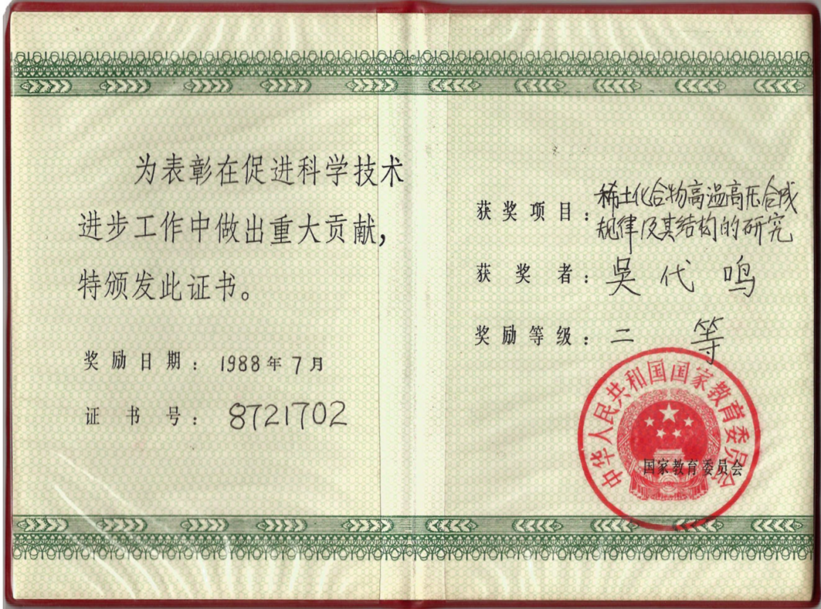 先生课上授知识,课下编教材,兢兢业业,勤勤恳恳,没有豪言壮语,没有高谈阔论,只用自己的实际行动默默地践行教师教书育人的神圣诺言,年复一年、日复一日不知疲倦地为一届又一届本科生和研究生讲授固体物理学之美,传授治学与为人之道,深受广大师生敬爱。1985年,BG大游官方网站授予他教学质量特等奖;1988年,他所主持的《固体物理课程建设》荣获吉林省优秀教学成果奖。一直以来,吴代鸣先生痴心不改,始终坚守教书育人的理想与信念,完美地诠释了“传业、授道、解惑”的师者品质,在BG大游官方网站旗下产业和公司产品的历史上留下了浓墨重彩的独特篇章。1990年,吴代鸣先生进入黄昆先生领导的全国固体物理教学指导委员会,他的教学理念、教学风格、教学才华得以被更多人了解,并成为全国固体物理教学的典范。先生将一生的时间和精力都投入到教书育人的事业之中,几十年如一日,春蚕吐丝,蜡炬成灰,殚精竭虑,呕心沥血,为我国物理人才的培养做出了卓越贡献。1992年,他被推选为“享受国务院政府特殊津贴专家”,这是大家对先生几十年躬耕教育事业所取得的成就的高度肯定,也是向他表达的崇高敬意。