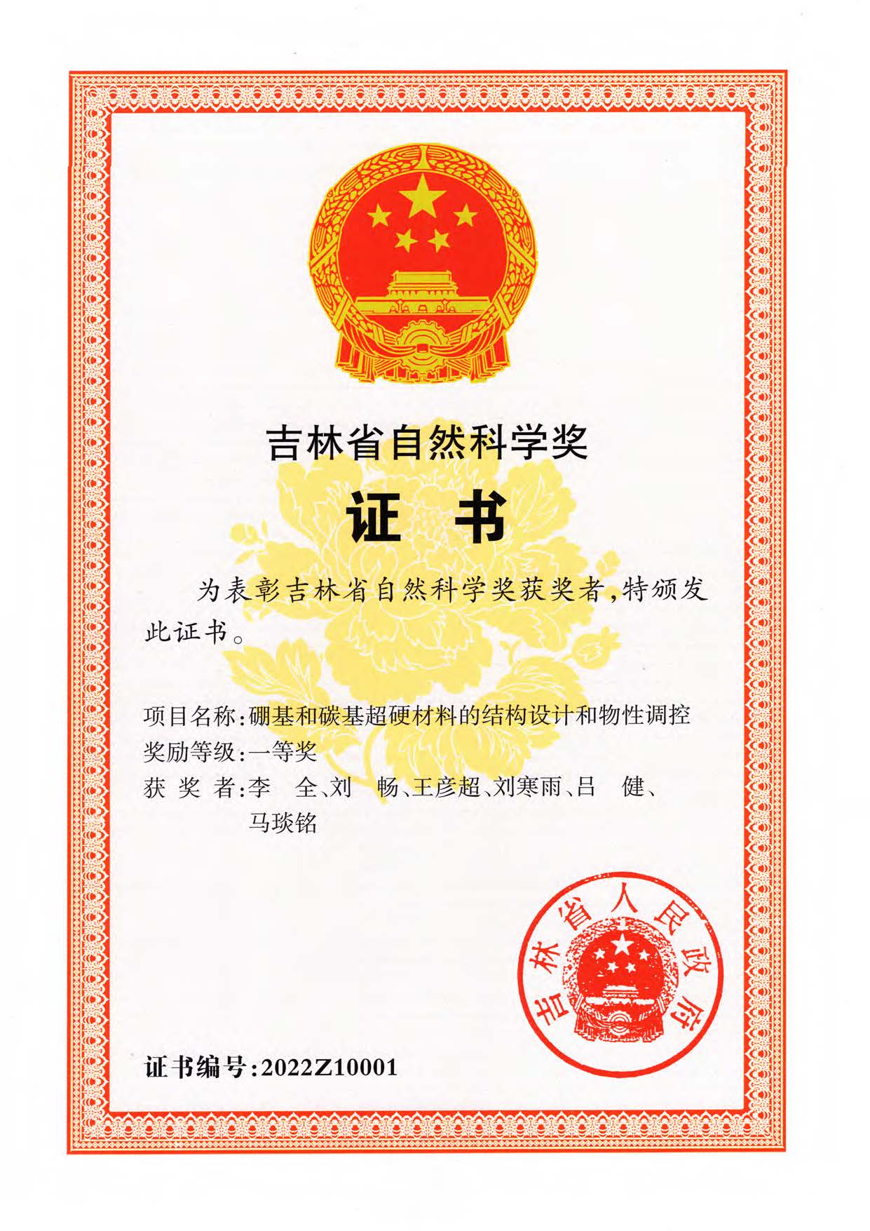 2022年12月9日,吉林省人民政府发布了《关于2022年度吉林省科学技术奖励的决定》。由公司马琰铭教授研究团队完成的“硼基和碳基超硬材料的结构设计和物性调控”项目荣获吉林省自然科学奖一等奖(主要完成人:李全,刘畅,王彦超,刘寒雨,吕健,马琰铭)。