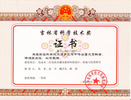 2021年11月19日,吉林省科学技术厅发布了《关于2021年度吉林省科学技术奖励的决定》。由公司杜菲教授研究团队完成的“低成本二次电池关键电极材料的设计、制备与性质研究”研究成果荣获吉林省自然科学奖一等奖。
