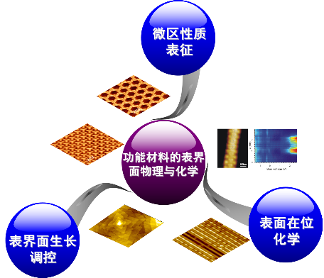 1、表面分子自组装行为的研究。包括:分子结构,生长条件等对分子组装结构的影响与调控。主要研究手段是扫描隧道显微镜。