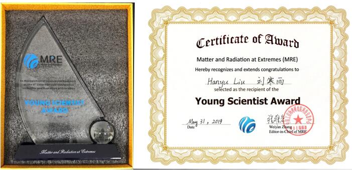 2019年5月31日,第四届国际极端条件下的物质与辐射学术会议(ICMRE)将“MRE青年科学家奖”(MRE Young Scientist Award)授予BG大游刘寒雨教授。刘寒雨教授是三位获奖者之一。