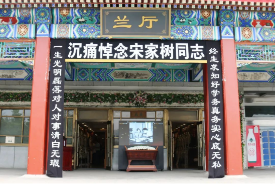 告别仪式大厅庄严肃穆,巨幅挽联“一生光明磊落对人对事清白无瑕,终生求知好学务真务实心底无私”垂立两侧,是宋先生一生的写照;横幅挽联“沉痛悼念宋家树同志”表达了对宋先生的深深敬意和无限追思。宋家树先生身盖鲜红党旗,安卧于鲜花翠柏之中。