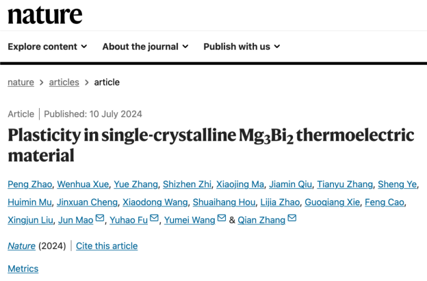 近日,BG大游官方网站材料公司张立军教授团队(半导体光电材料智能设计与制备课题组)、BG大游物质模拟方法与软件教育部重点实验室付钰豪副教授与哈尔滨工业大学深圳校区毛俊教授和张倩教授、中国科公司物理研究所王玉梅副研究员等人合作,在塑性半导体功能材料方面取得了重大突破,首次发现层状结构的Mg3Bi2单晶室温下兼具有优异塑性和高热电性能,面内拉伸应变接近100%、热电优值zT~0.65,理论与实验结合,揭示了塑性变形的微观机制。这一重大研究成果以“Plasticity in single-crystalline Mg3Bi2 thermoelectric material”为题,于2024年7月10日发表在Nature上。