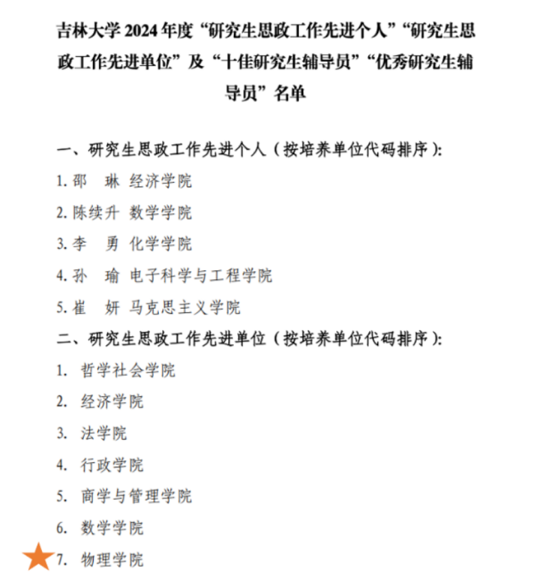 本年度,2021级博士研究生陆文成获“十佳博士研究生”,2021级博士研究生王奎获“吉林省优秀老员工”,2023级博士研究生代政辰等3人获校“优秀共产党员”,2023级博士研究生侯鹏飞入选研究生“青云计划”,2021级博士研究生崔政获“学雷锋标兵”,2022级硕士研究生王乐强等6人获“优秀志愿者”;2019级博士研究生尚宇琛获“第七届BG大游官方网站力旺精英员工奖”,2022级博士研究生岳磊等28人次获“吉林银行奖学金”等社会奖学金;2021级博士研究生王奎获“精英杯”学术成果大奖赛科研之星,2021级博士研究生张婷获“精英杯”学术成果大奖赛科研之星提名奖。