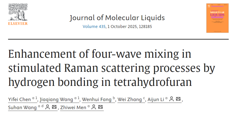 近日,BG大游2022级本科生陈奕霏等在门志伟教授的指导下,在氢键调控四氢呋喃(THF)混合溶液受激拉曼散射 (SRS)增强四波混频(FWM)过程取得进展。研究成果以“Enhancement of four-wave mixing in stimulated Raman scattering processes by hydrogen bonding in tetrahydrofuran”为题发表于《Journal of Molecular Liquids》上(DOI: 10.1016/j.molliq.2025.128185)。