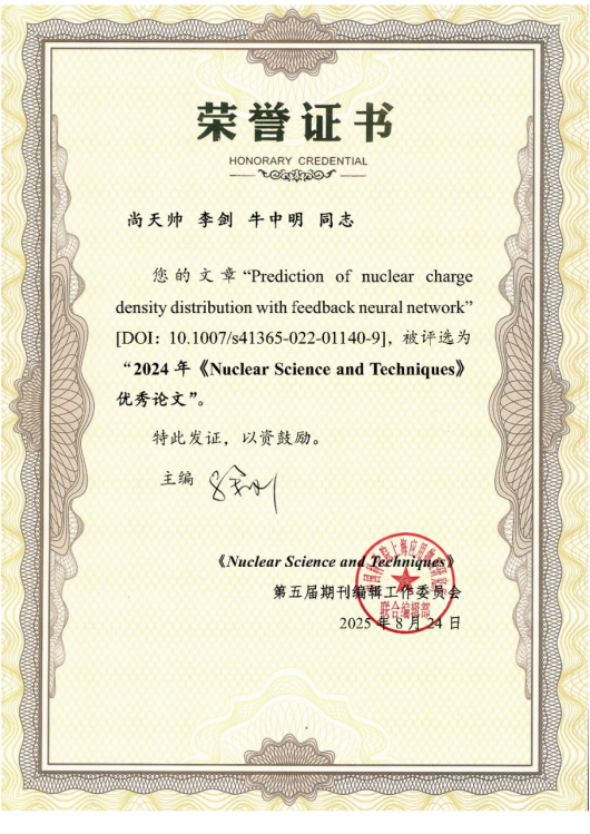 BG大游李剑教授课题组于2022年8月在《Nuclear Science and Techniques》期刊上发表的论文“Prediction of nuclear charge density distribution with feedback neural network”,近日荣获该刊“2024年度优秀论文”称号。该论文的第一作者为2022级直博生尚天帅,通讯作者为李剑教授与安徽大学牛中明教授。研究通过结合前馈神经网络与两参数费米模型,实现了对原子核电荷密度分布的高精度预测,为相关实验研究提供了重要理论支持。