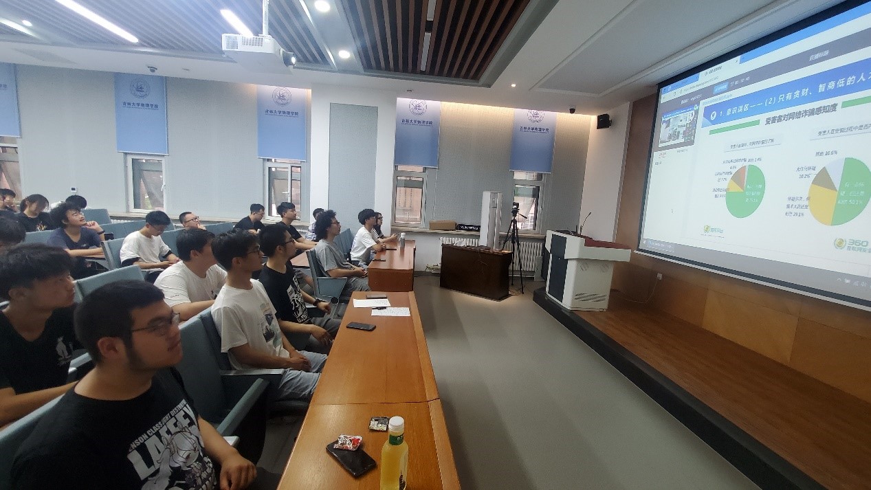 公司在物理楼333会议室设立分会场,组织未能前往主会场听课的员工共同学习。还有部分员工以班级为单位在宿舍通过链接观看课程视频直播,认真学习防诈骗相关知识并在班级群,年级群积极讨论分享学习要点,如防诈骗电话96110等。全院本科生积极响应。