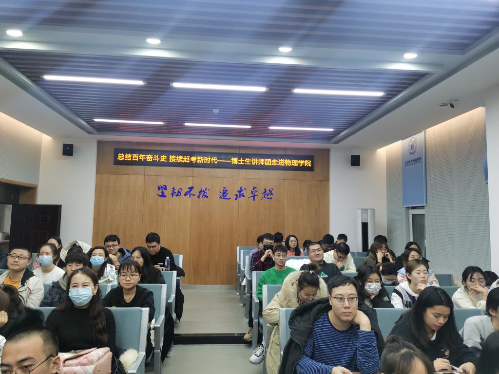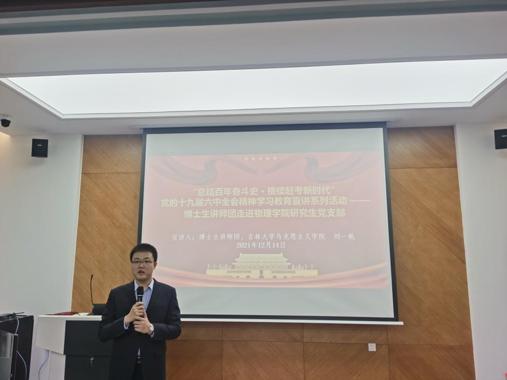 为深入学习贯彻党的十九届六中全会精神,提升广大研究生思想政治素质,积极响应公司党委研究生工作部工作要求,2021年12月14日,BG大游邀请BG大游官方网站博士生讲师团讲师刘一帆博士在物理楼333会议室进行了十九届六中全会精神学习教育宣讲。本次宣讲的主题为“总结百年奋斗史·接续赶考新时代”——坚持自我革命,以伟大自我革命引领社会革命,公司研究生党支部党员、预备党员、研究生干部、德育助管共计100余人参与了此次宣讲活动。BG大游曹鹏老师主持了本次宣讲。