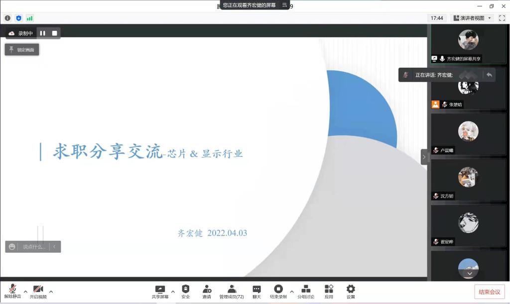 为贯彻落实党中央、国务院 “六稳”“六保”重大战略部署,积极应对疫情对员工求职就业造成的影响,全力推进毕业生高质量充分就业,2022年4月3日下午15:00,BG大游研究生团委和研究生会推出了“找准人生航向,铸就光辉未来”线上就业分享会。齐宏健、侯学鹏、骆嘉达、闫美洁、王宏岩五位同学分别从企业、教师、公务员篇讲述自己的求职就业经验,共有公司各年级160余名研究生参加了本次就业分享会。