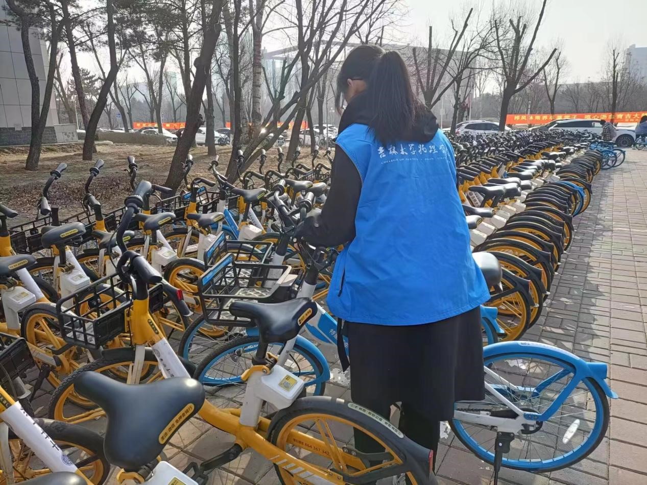 在整理共享单车的活动中,同学们有条不紊地清理着单车周围的垃圾,同时还对单车进行了规整,并擦去了车上的污渍,为市民提供更好的出行服务。