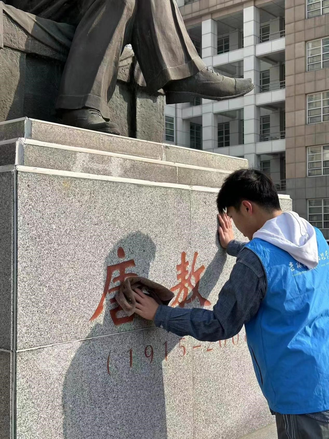 在擦雕像的活动中,同学们认真地擦拭着雕像的每一个角落,使之更加光彩照人,增强员工爱院荣院意识的同时,彰显了雷锋精神的伟大价值。
